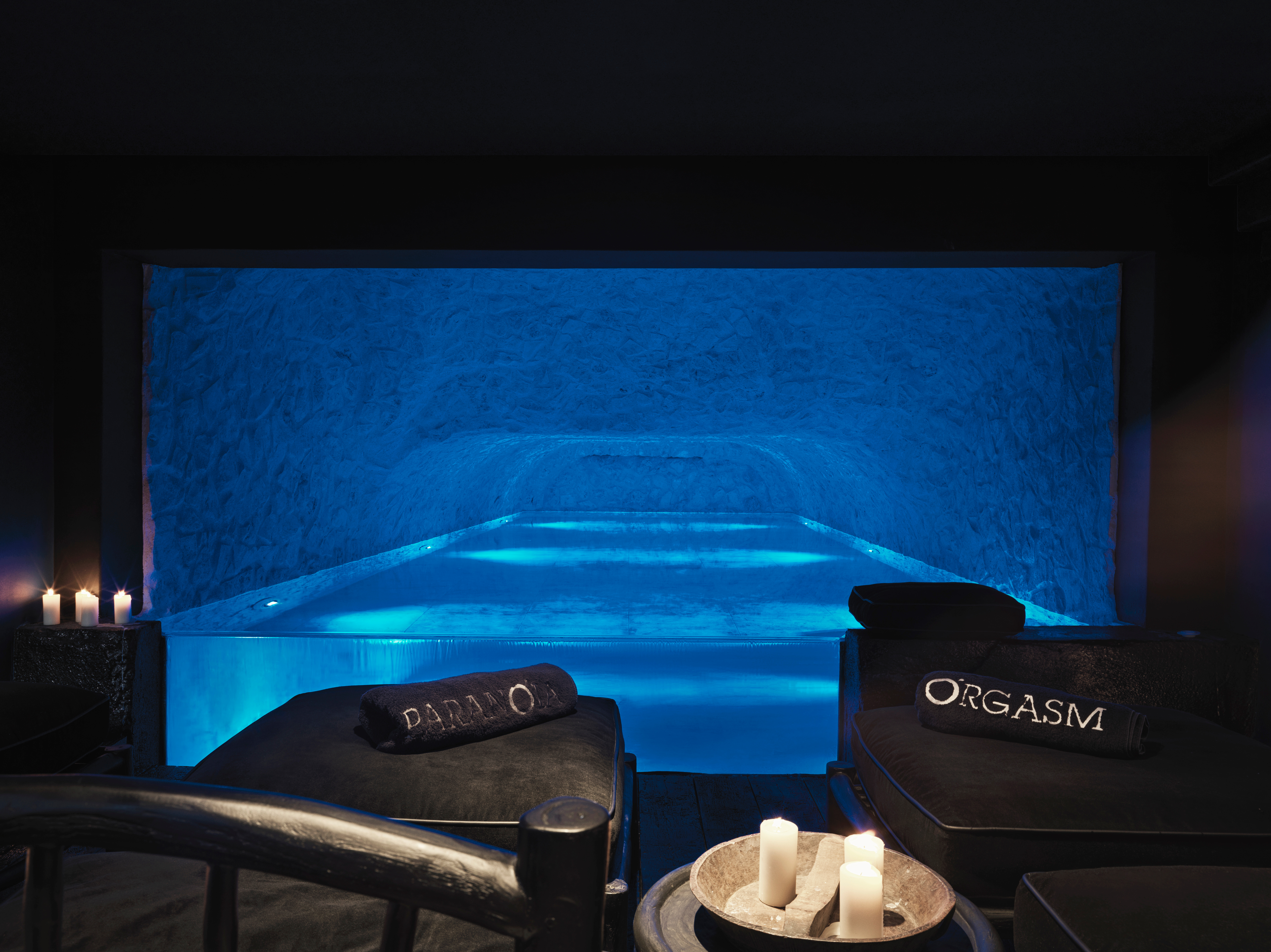 The whole concept here is based on the circle of life, even down to its name. So, O knows how to round off the party and set the tone to unwind. Deep, sensual and a little bit gothic, it feels like the designers took the archetypal Greek uniform of airy whites and rattans and inverted it. Lashings of black and granite (alongside retro vinyl players and quirky yellow dial phones) update the look to an Instagrammer’s sultry dreamland. The atmospheric moodiness crescendos in the spa. Here, dimmed lighting and a pool built into the rock amplify a feeling of being in an ethereal Greek grotto.