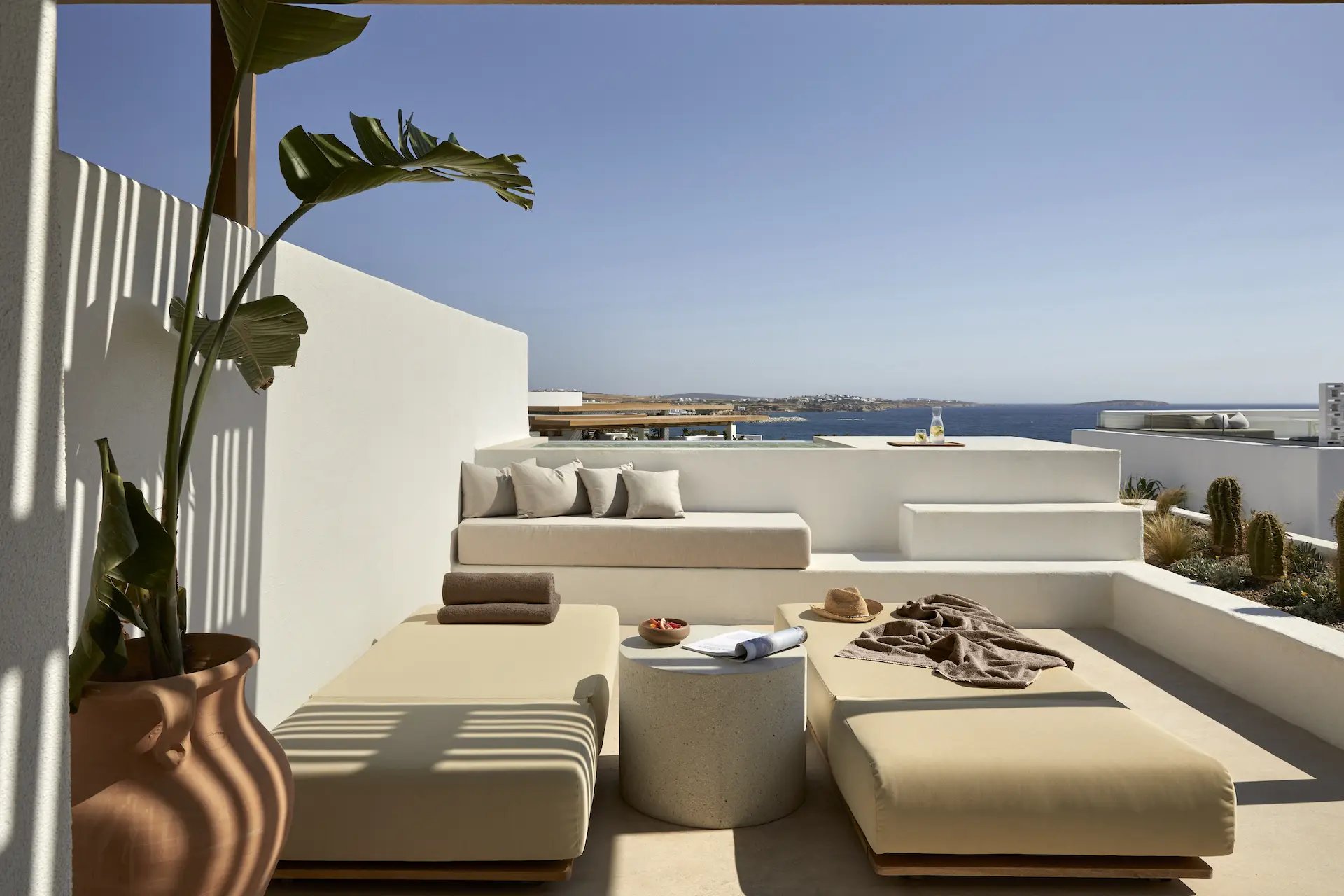 Playtime flirts with privacy in an exclusive corner of Ornos beach, where Mykonos’ leading luxury hotel brand have bathed every inch of this place in cosseted cool.