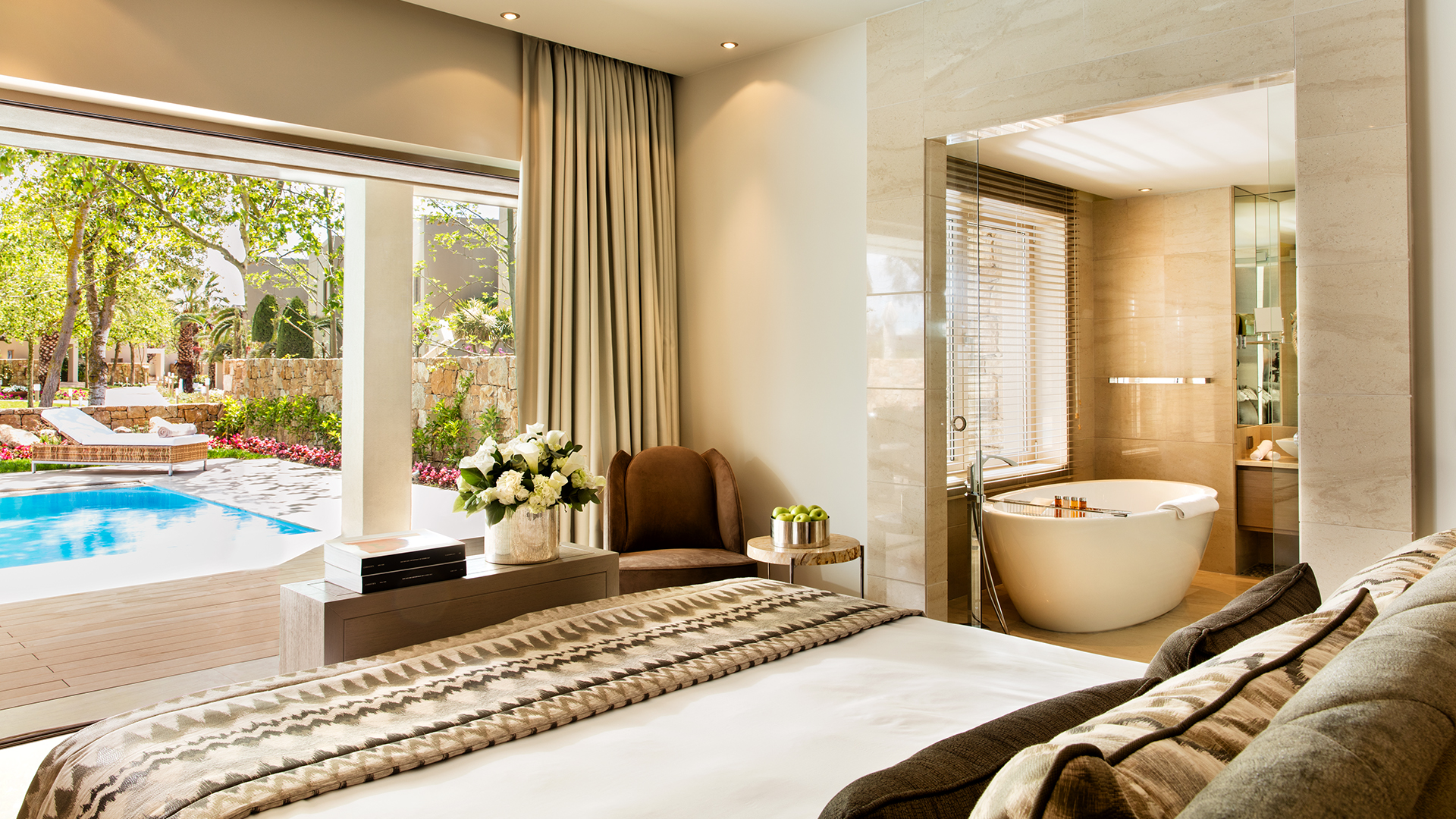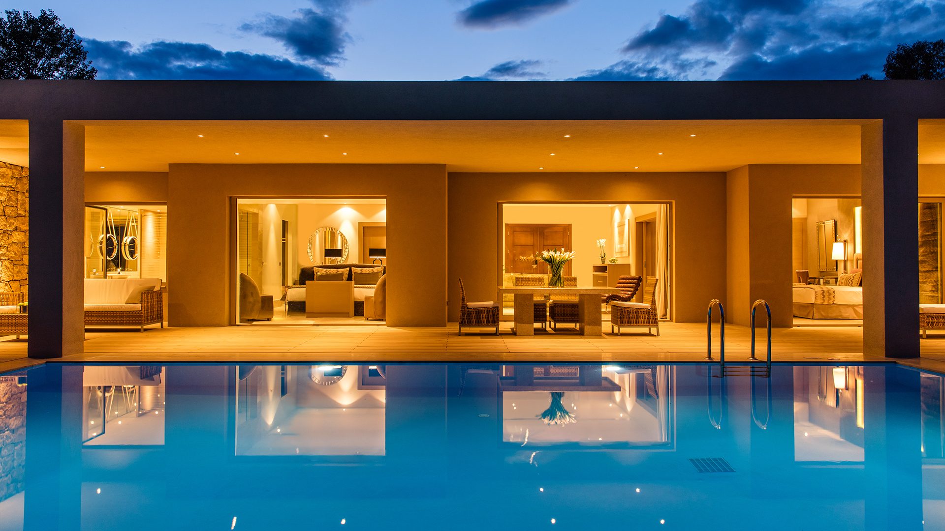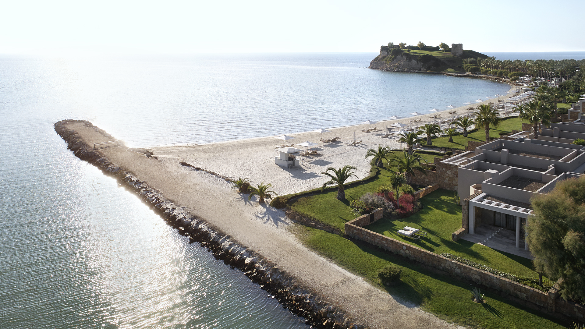 Inspired by old Messinian mansions, this picture-perfect retreat with a half-mile sandy beach by the glittering Ionian Sea, comprises clusters of stone built low-rise villas.
