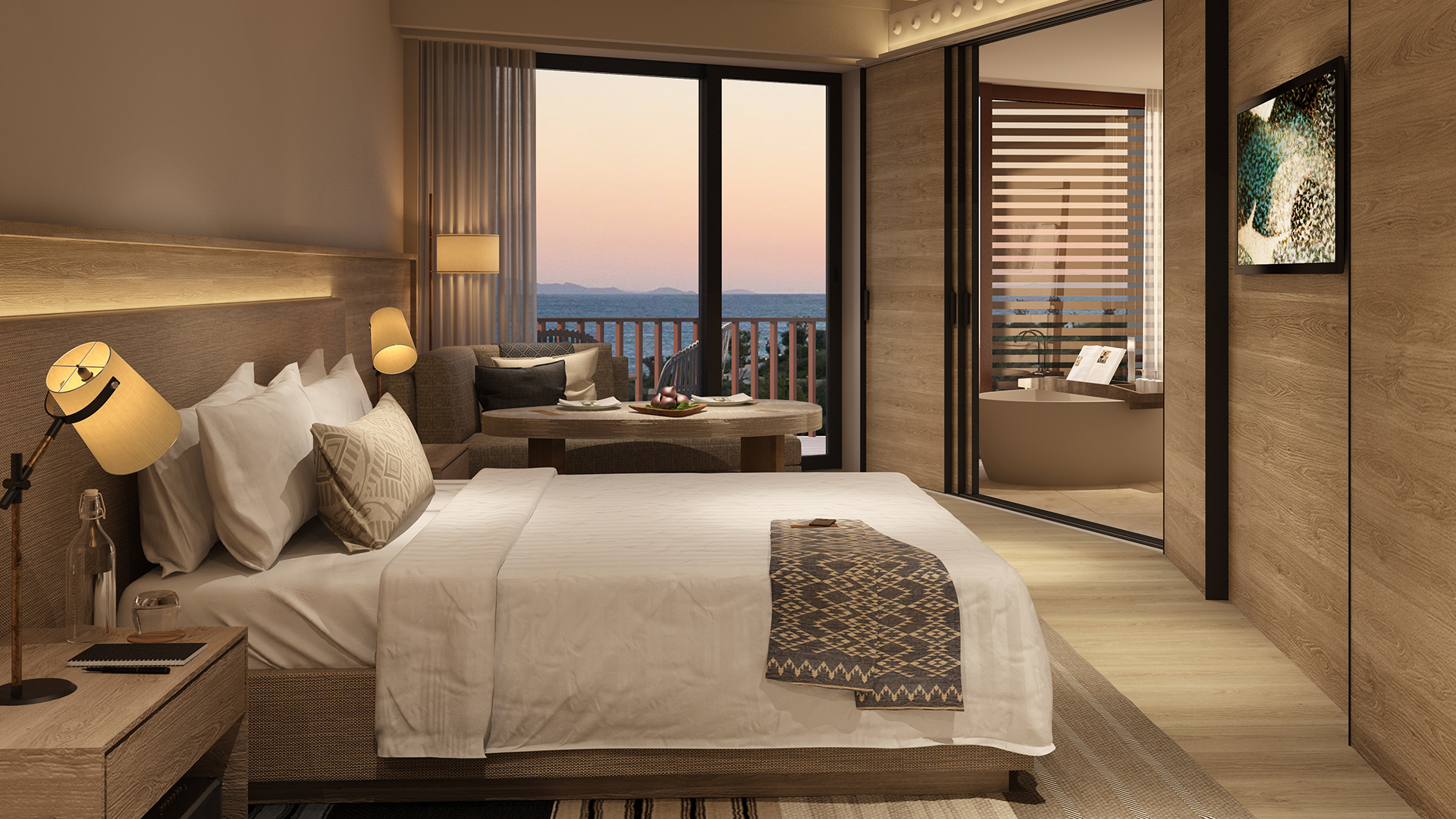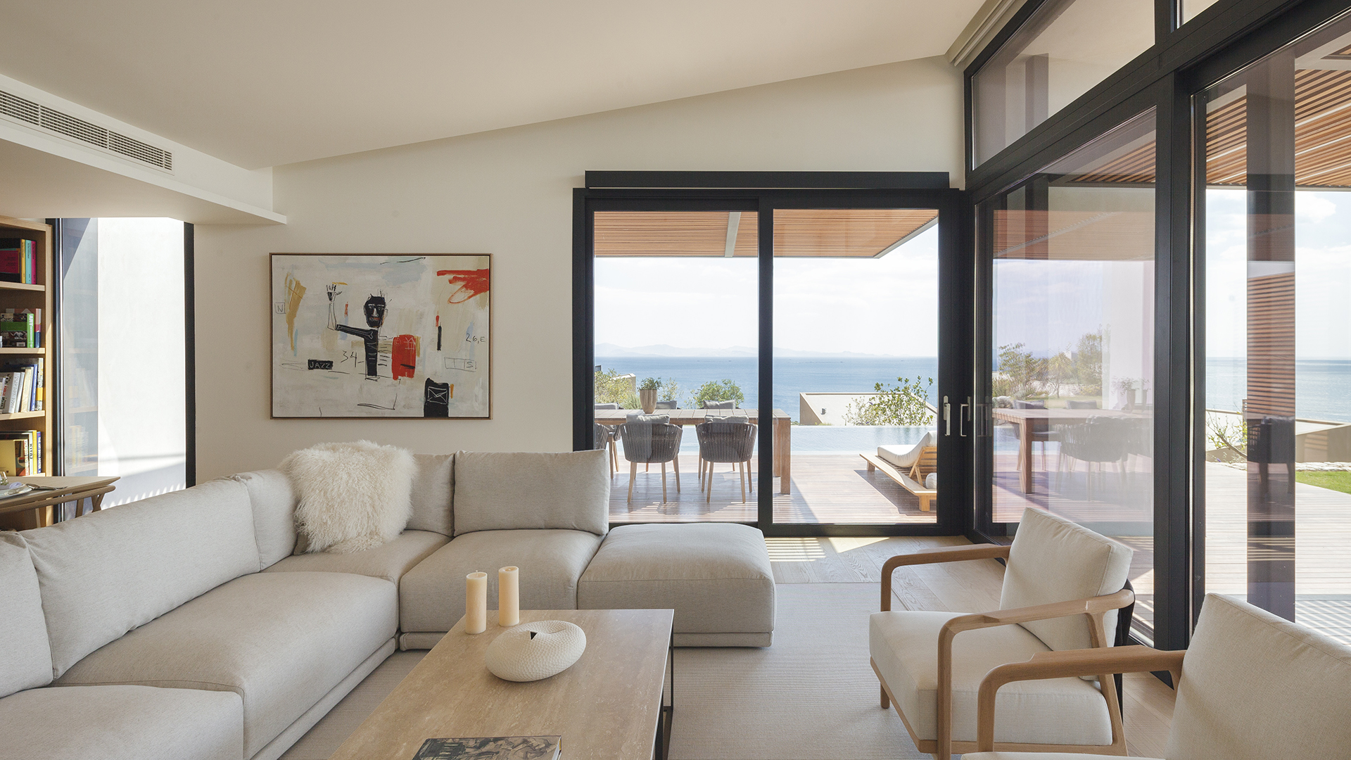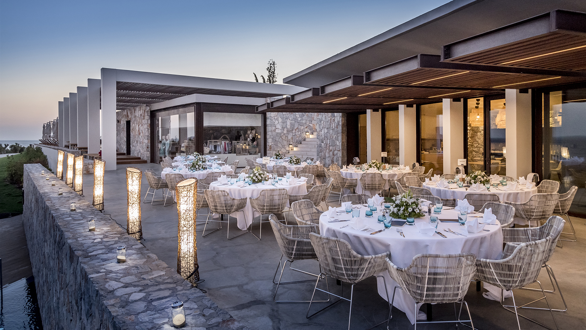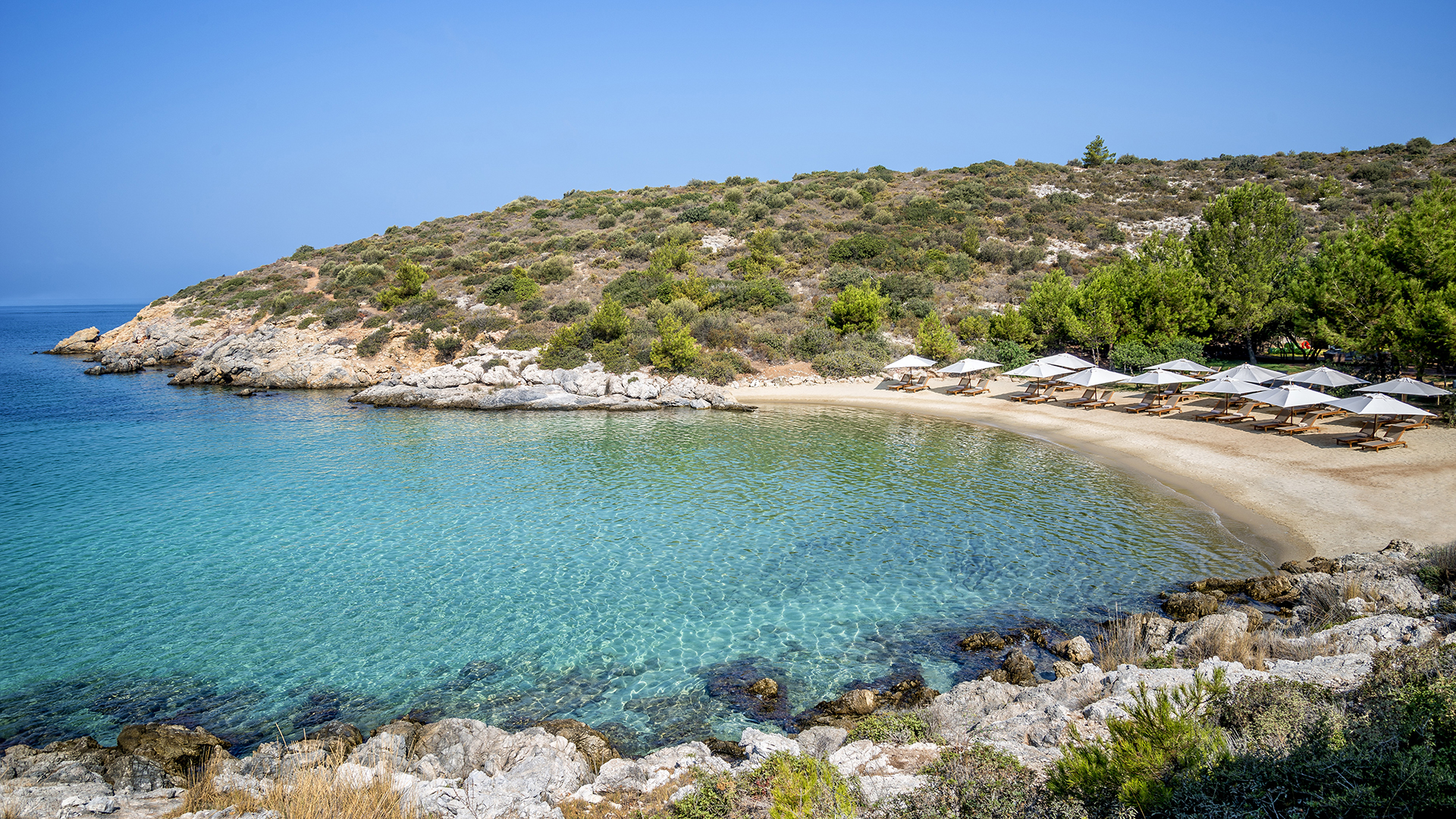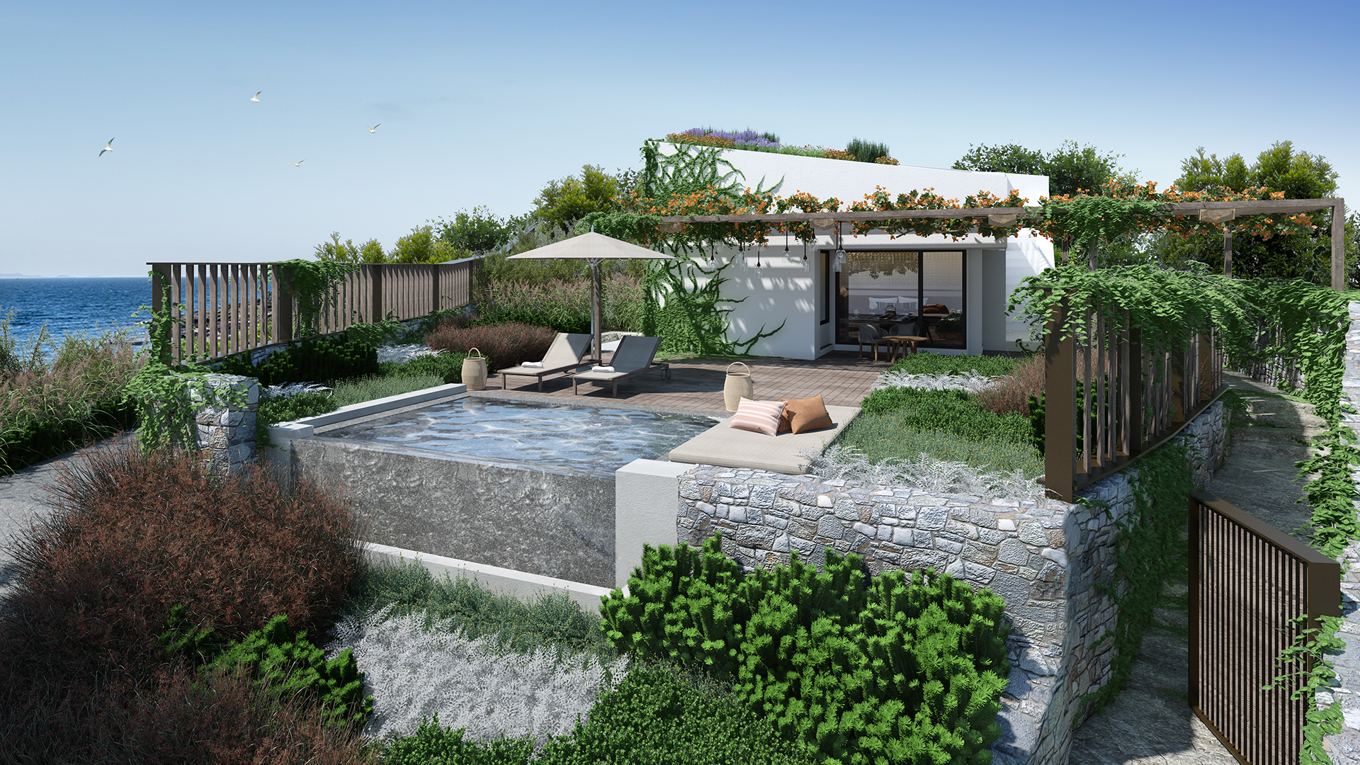 Having opened in May 2018, rooms, suites and villas are carved into the rock face, and cascade down towards the coastline – some with large terraces and private pools; all with views of the Aegean Sea.