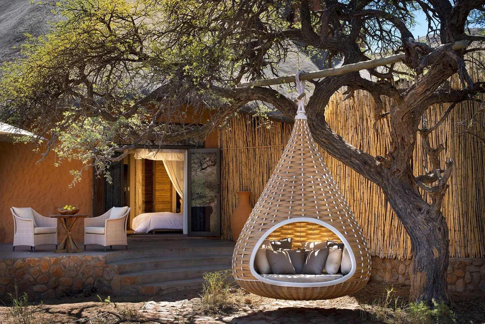 Each camp is perfectly positioned to take in the reserve’s dramatic landscapes, characterised by savannah grasslands, red dunes and ancient mountains.