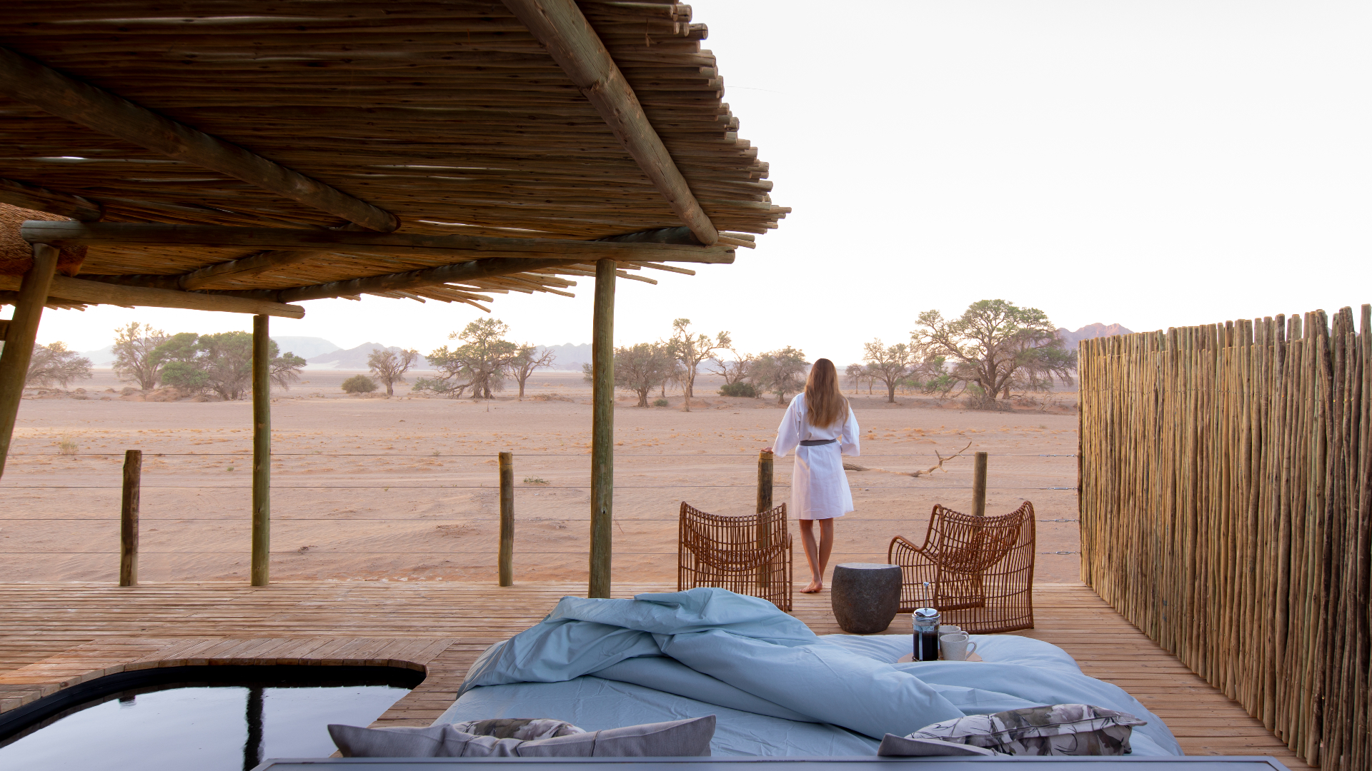 Meanwhile, the Namib Sand Sea, a UNESCO World Heritage Site in the south of the Namib Desert, presents vistas bathed in fog that could be mistaken for apparitions. Through a private gate from Wilderness Little Kulala camp, footsteps will lead you straight into the salt pan of Sossusvlei, which is surrounded by imposing martian dunes, stained rust red. A hike up the 300-metre peaks reveals life-affirming panoramas of the tranquil white valley below.